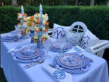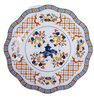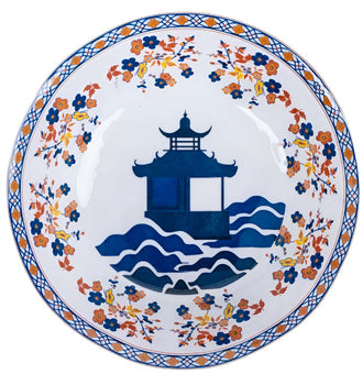 Charger (Sold Individually): Enhance your table setting with this decorative charger, featuring the striking blue and white pagoda pattern with burnt orange floral accents. It provides a beautiful base for your dinner plates, adding an extra layer of sophistication.