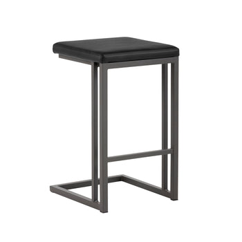 A modern industrial stool featuring a backless seat in onyx faux leather. Finished with a cantilever steel frame and footrest in a champagne gold painted finish. Suitable for various dining, kitchen and bar spaces of all sizes. Champagne gold steel has a copper undertone. Handle With Care: This design has been crafted with faux leather. Faux leather is manufactured to reflect the natural characteristics of leather; as such, colour variations, markings wrinkles, grooves, and light scratches are appreciated characteristics. No two pieces will be alike. Visit our Product Care page for more information on how to ensure the lasting beauty of this piece.