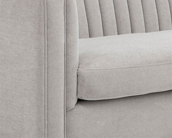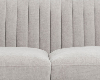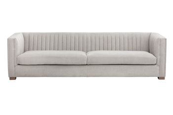 Make a statement with this modern sofa featuring striking channel tufting on the seatback. Stocked in our hemingway silver fabric with antique brass feet. Suitable for residential and commercial environments.