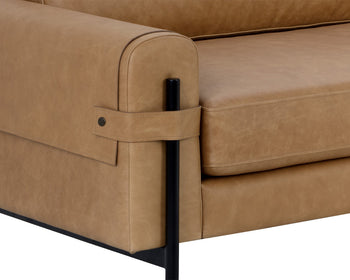 With its classic silhouette and low profile, the Camus Sofa will add comfort to any room. Generously upholstered in soft ludlow sesame leather that is as stylish as it is luxurious. Strap detailing on the front and back of the rounded armrests provide a playful accent to the piece. Completed with black iron legs. Handle with Care: This design has been crafted with top grain leather. Leather is a natural material; as such, colour variations, markings, wrinkles, grooves and light scratches are acceptable and appreciated characteristics. No two pieces are alike. Visit our Product Care page for more information on how to ensure the lasting beauty of this piece.
