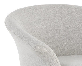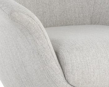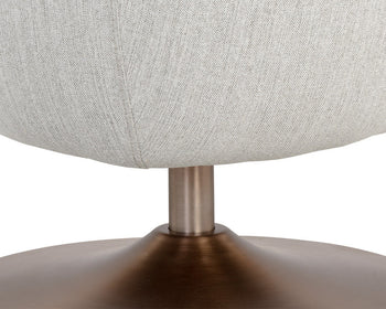 Defined by beautiful fluid curves, this mid-century inspired swivel lounge chair incorporates a dash of contemporary style for a stand out look. Stocked in abbington navy fabric and features diamond quilting on the interior. Completed with a stainless steel base in an antique brass finish. Also available in mina taupe fabric.