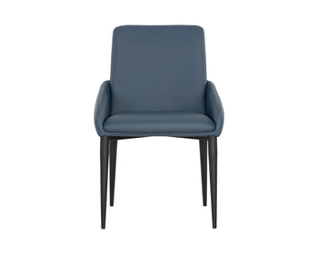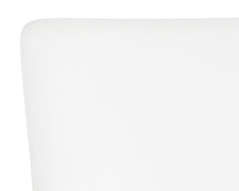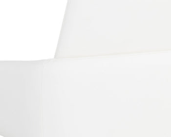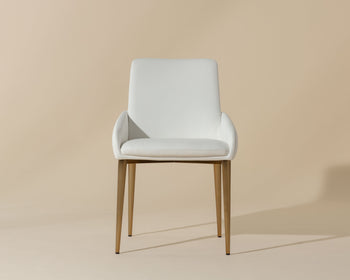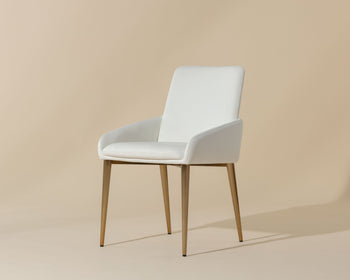 Add a touch of sophistication to dining spaces with this stylish dining armchair that features curved armrests. Upholstered in dillon snow faux leather and features stainless steel legs in a gold finish. Handle With Care: This design has been crafted with faux leather. Faux leather is manufactured to reflect the natural characteristics of leather; as such, colour variations, markings wrinkles, grooves, and light scratches are appreciated characteristics. No two pieces will be alike. Visit our Product Care page for more information on how to ensure the lasting beauty of this piece.