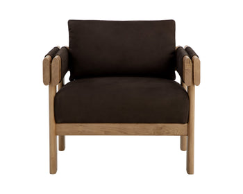 Crafted from natural materials, the Carmichael Lounge Chair adds an inviting atmosphere to any room. The beautiful characteristics of rustic oak wood and nubuck cocoa leather are emphasized through the chair's double armrest design. As wood is an organic, porous material, these pieces will contain natural variation of texture and may also exhibit fine indentations and cracks. Wood pieces will also display a disparity of colour and grain, and visible knots and burls that add to the character of each piece. Handle with Care: This design has been crafted with 100% nubuck leather. Leather is a natural material; as such, colour variations, markings, wrinkles, grooves and light scratches are acceptable and appreciated characteristics. No two pieces are alike. Visit our Product Care page for more information on how to ensure the lasting beauty of this piece.