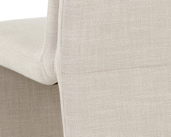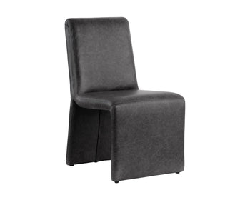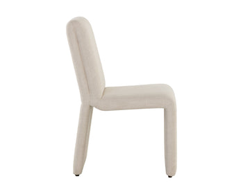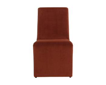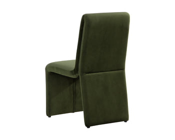 Create an alluring dining space with this modern dining chair that features an intriguing silhouette. Stocked in moss green fabric with a fully upholstered wooden base.