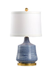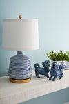 This cobalt blue and white glazed porcelain table lamp features a curved silhouette and texture reminiscent of a beehive. The antique gold leaf base and matching finial add a warm glow while the off white linen tapered drum shade completes this look. The classic colors make this ideal for any table, nightstand or desk in a traditional design scheme.