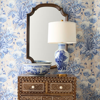 Blue and white ceramic with hand painted design on antique gold leaf mount.