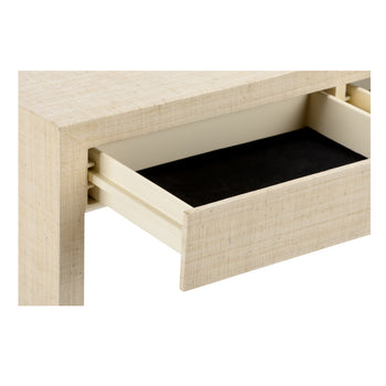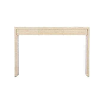 The stunning simplicity of this piece belies it's beauty and utility. The versatile console has the perfect depth for most any space. It features three subtle drawers for needed storage and is covered in cream-colored raffia. Designed by Elizabeth Wicker.