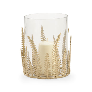 Delightful glass hurricane candleholder with delicate brass finished metal fern leaves. (Candle not included)