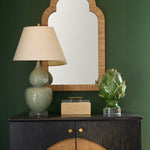 Combine a modern double gourd design with a sleek green crackle gaze finish for a lamp versatile enough for any decorative style. The Fulton Vase is a 31" accent lamp that features a ceramic body on a clear acrylic base with an antique brass ball finial and accents. A classic eggshell linen shade completes the look.