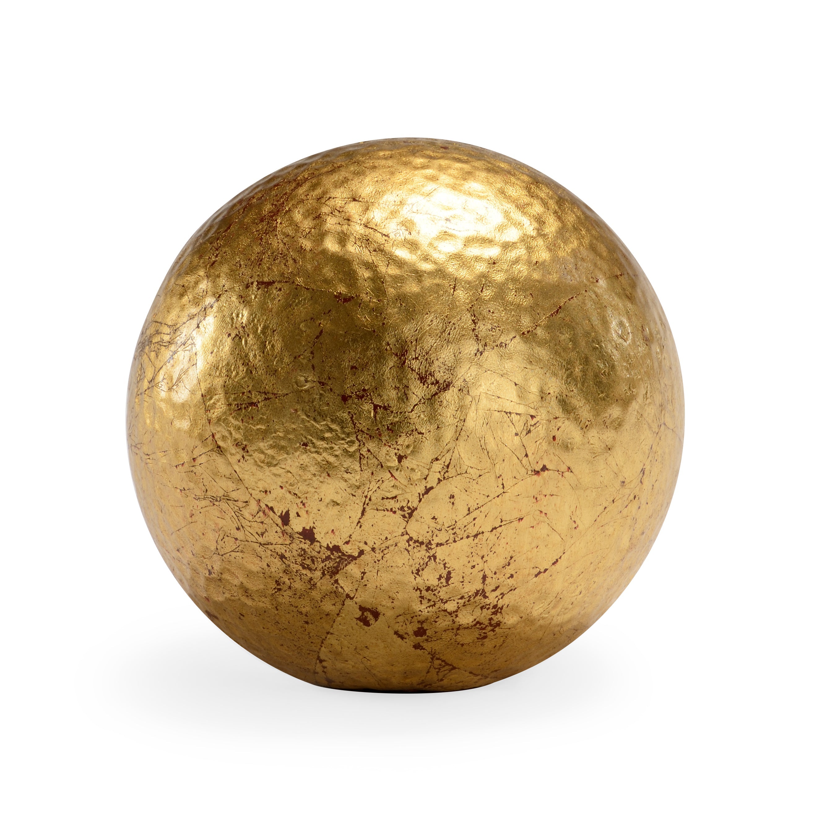 Looking for a small neutral accent to fill a space in your home or office decor? Hammered ball could be the perfect choice. This 5" composite orb has a hammered design pattern and is finished in gold leaf which emits a warm glow. Use solo for a small space on a tabletop or bookshelf or combine with our 4" and 6" hammered orbs to complete your modern look. Designed by Claire Bell.
