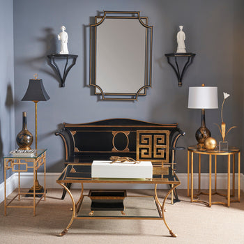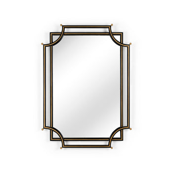 London Church Mirror features two metal frames stacked to give added dimension to this modern design. The bottom frame is a rectangular shaped black frame with a gold accent that houses a plain mirror. The top frame is a larger rectangular frame with rounded out corners and gold accents. This unique 45" wall mirror comes ready to hang in your home. Bradshaw Orrell design