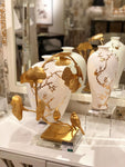Matte white glazed porcelain vase with metallic gold hand painted cherry blossom design and trim. Vase mouth opening: 2.75w x 2d.