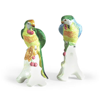 Elegant beauty abounds with this nature inspired pair of parrots with cherries. These delicate birds are hand painted and made of Italian ceramic . The vibrant colors and detailed design make this an eye catching statement for your decor. Display on bookcases, tabletops or on shelves flanking a mirror or painting. Made in Italy.