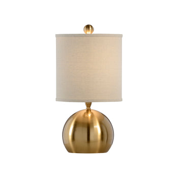 Enhance your modern flair with this small brass ball lamp. Made of iron with a brushed brass finish this small lamp gives both warmth and versatile style to any space. A matching brushed brass finial secures the natural linen deep drum shade to complete a design of fashion forward brilliance.