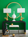 Raffia covered console table with antique brass feet. Designed by Jamie Merida.