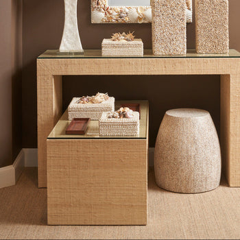 Set of two elegant boxes with individually applied Nassa and assorted shells are a perfect addition to any beach themed decor. The fabric lining and removable top make this set an ideal storage solution for small treasures around your home. Small box: 8 1/2w x 8 1/2 d x 5h