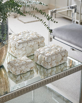 Feature this lovely set of three boxes with individually applied seashells in your coastal themed room or home. Each box is lined with white fabric and is perfect for storing small treasures and bringing cohesion to your space. Small box: 8w x 60 x 3 1/2h, Med box: 9 1/2w x 7 1/2d x 5 1/2h