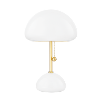 Cortney is a gorgeous combination of mixed glass with Aged Brass. An opal glossy glass shade is captured within a clear glass shade for a look that is both trendy and useable. Light flows through the open shades and reflects inside them. The opal glass table lamp, with its visible Aged Brass pull chain, adds a stylish pop and polish to any space. Also available as a wall sconce, semi-flush, and pendant. Part of our Home Ec. x Mitzi Tastemakers collection.