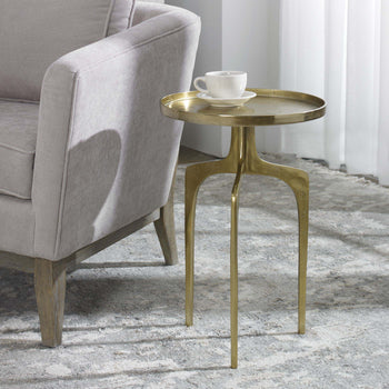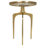 The unique design of this accent table features three curved legs and a solid round top, which is accented with a .75 raised lip. This cast aluminum table is finished in a slightly textured soft gold. Perfect beside your favorite chair! Also available in