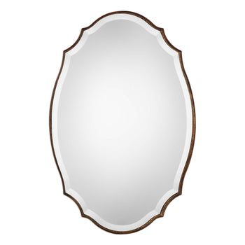 A shaped beveled mirror sits atop a rounded edged frame, finished in an antique bronze and gold finish. The bevel is 1. May be hung either vertically or horizontally.