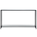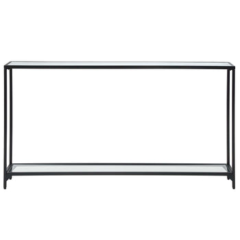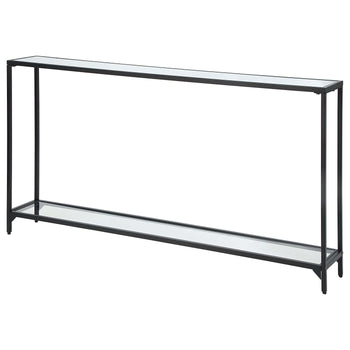The narrow, simple profile of this iron console table will make it perfect for a foyer or any limited space. The clean lines and modern design are accented in a satin black finish. The top shelf is mirrored, with tempered glass on the lower shelf. Anti tip hardware included.