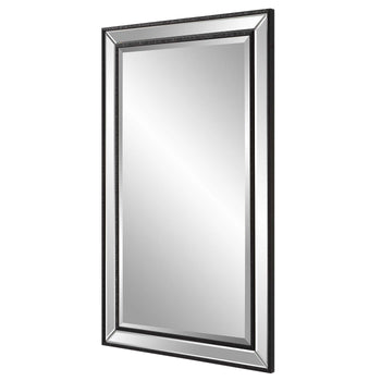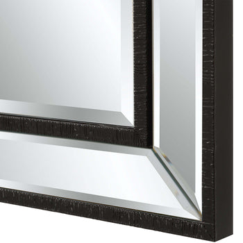 This elegant frame features beveled mirror panels, accented with a black organic textured design that surrounds the frame. The inner mirror has a .75 bevel. May be hung either vertically or horizontally. Also available in gold, W00553.