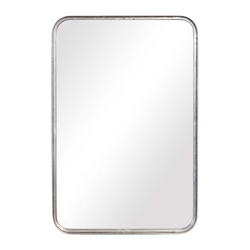 This frame, with its rounded corners and inner ledge, is made of a thick metal strap and finished in a burnished silver leaf. May be hung either vertically or horizontally.