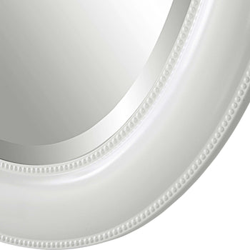 Beaded details enhance the simplicity of this pure white oval frame. The mirror has a 1 bevel and may be hung either vertically or horizontally. Also available in bronze, W00425, and silver, W00529.