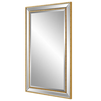 This elegant frame features beveled mirror panels, accented with a gold organic textured design that surrounds the frame. The inner mirror has a .75 bevel. May be hung either vertically or horizontally. Also available in black, W00552.