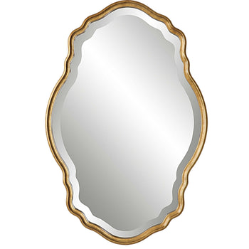 Graceful curves add elegance to this unique mirror. The frame features a rich gold finish with amber glaze. The mirror has a 1.25 bevel. May be hung either vertically or horizontally. Also available in antiqued silver, W00434.