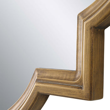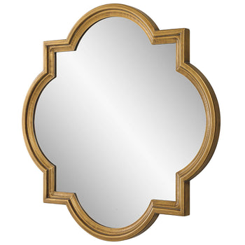 The unique design of this quatrefoil framed mirror is enhanced by the beautiful gold finish. A gray glaze accentuates the curves and straight lines, giving the frame added depth and character.