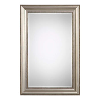 This beautiful frame features small beaded details surrounding the outer and inner frame and is finished in a lightly antiqued champagne silver leaf. The mirror has a 1 bevel. May be hung either vertically or horizontally. Also available in dark bronze