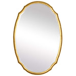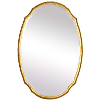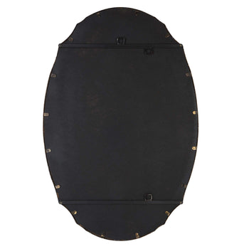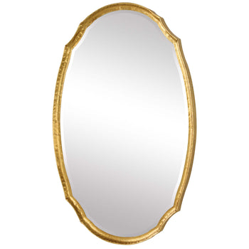 This oval shaped frame is made of hammered metal and features a concave surface. It is finished in a lightly antiqued gold leaf. The mirror has a generous 1.25 bevel. May be hung either vertically or horizontally. Also available in silver, W00447, and ch
