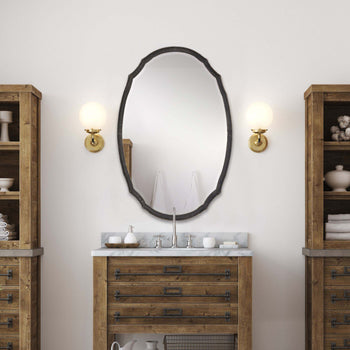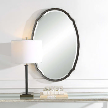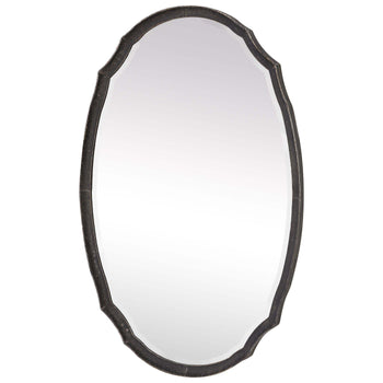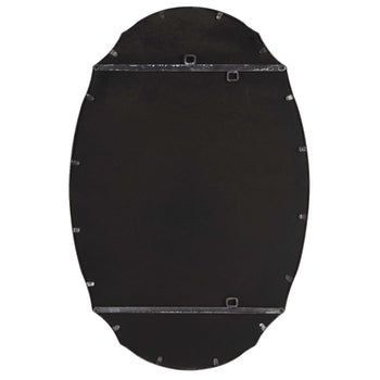 This oval shaped frame is made of hammered metal and features a concave surface. It is finished in a lightly distressed charcoal. The mirror has a generous 1.25 bevel. May be hung either vertically or horizontally. Also available in silver, W00447, and g