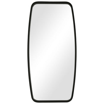 Unique frame featuring a thick metal band with rounded corners and a thin inner tubing around the mirror. It is finished in a matte black. Perfect over a vanity or in a foyer and may be hung either vertically or horizontally. Also available in silver leaf