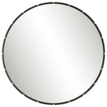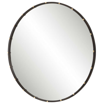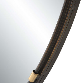 This 35 round metal frame, finished in a dark rich bronze, features a narrow rod that sits atop the flat surface of the frame. The rod is attached with small rings, finished in a lightly antiqued gold. This beautiful finish combination gives this frame a