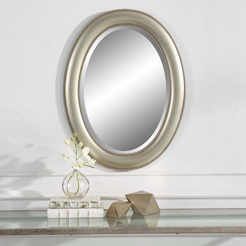 Beaded details enhance the simplicity of this oval frame. The finish is a metallic silver with subtle brown antiquing. The mirror has a 1 bevel and may be hung either vertically or horizontally. Also available in bronze, W00425, and white, W00530.