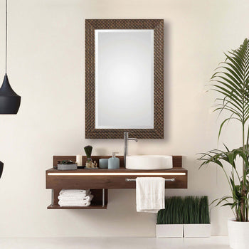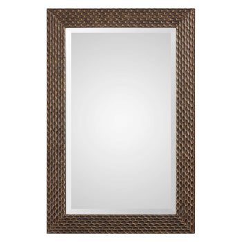 This versatile rectangular mirror features a unique carved honeycomb texture and finished in a rust bronze with gold highlights. The mirror has a 1 bevel. May be hung either vertically or horizontally. Also available in pewter, W00519.