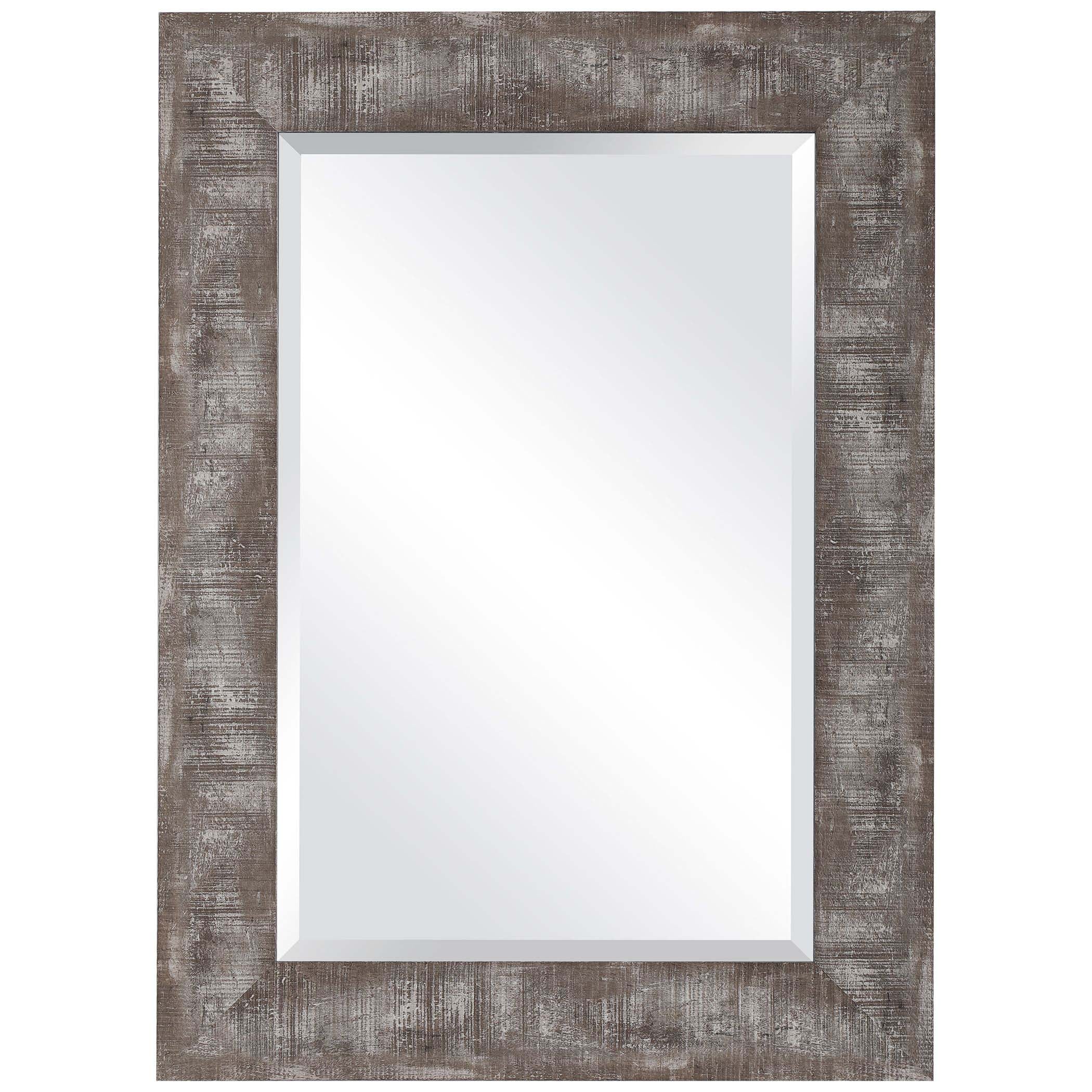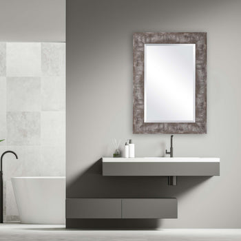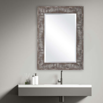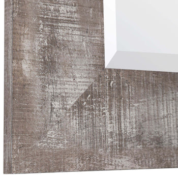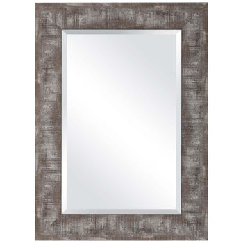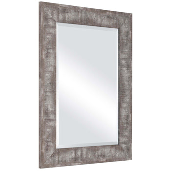 This rustic frame, with it's natural wood grain appearance, is finished in a light wood tone and distressing throughout. The mirror has a 1 bevel. May be hung either vertically or horizontally.