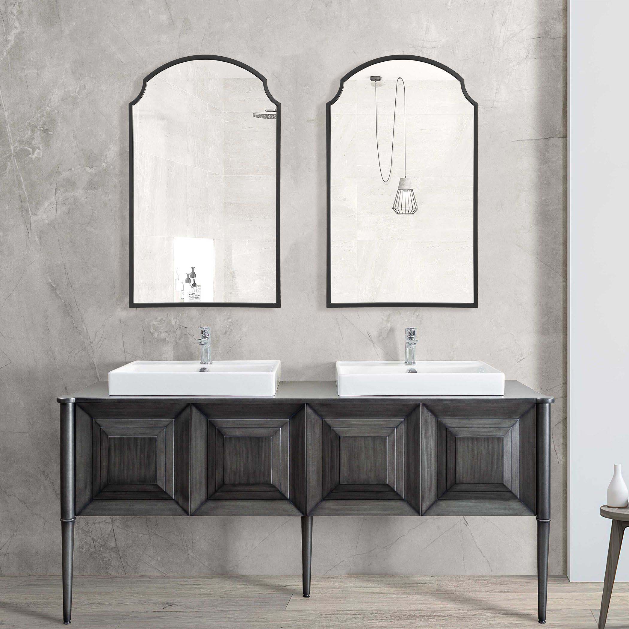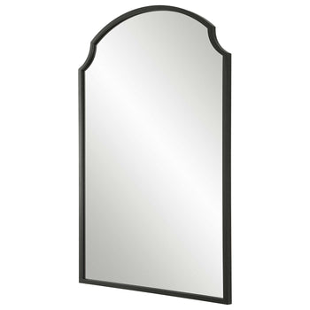 Beautiful arch top metal frame featuring scalloped corners and finished in a satin black. Also available in a bronze, W00576.