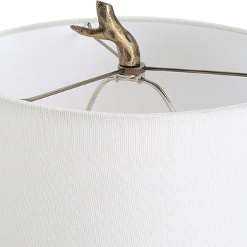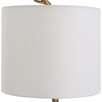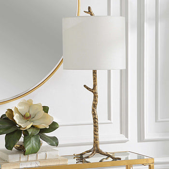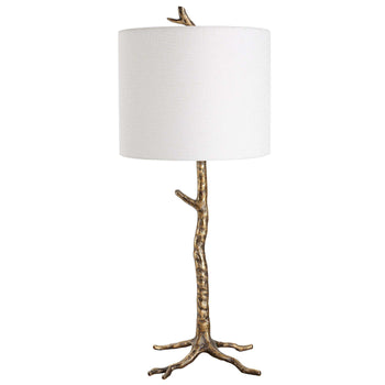 Hand cast with an organic base, this rustic lamp brings the look of nature indoors. The antique gold finish is enhanced by the lamp's textured surface. The round hardback drum shade is a soft white linen fabric. Also available in a gunmetal finish, W26059