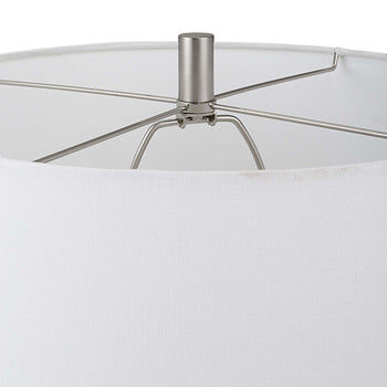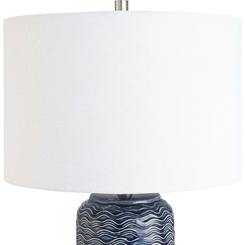 Beautiful blue ceramic table lamp features a wavy texture, accented with brushed nickel. The round hardback shade is a white linen fabric. Also available in white, W26093-1.
