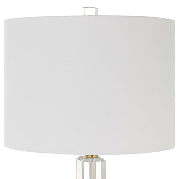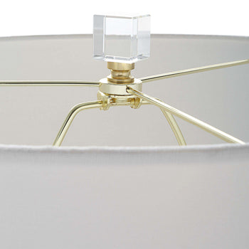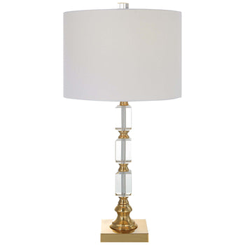 This elegant table lamp features stacked crystal separated by brass plated accents. The round hardback shade is a white linen fabric with light slubbing.