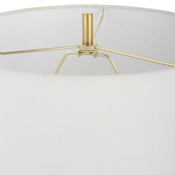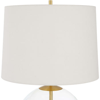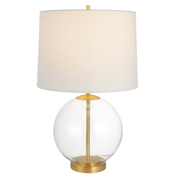 The clear body is complemented with gold accents and is finished with a slightly tapered white linen shade.