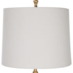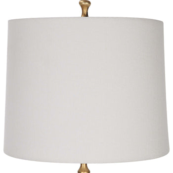 A vibrant gold leaf finish accentuates the stacked miniature hourglasses which form this simple, yet elegant table lamp. The metal body sits atop a beautiful round crystal base. The slightly tapered shade, with its rolled edge, is an ivory linen fabric. T