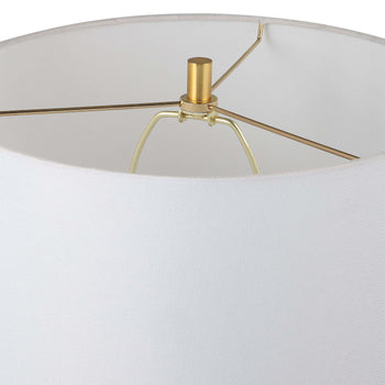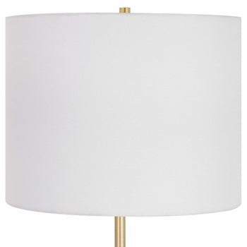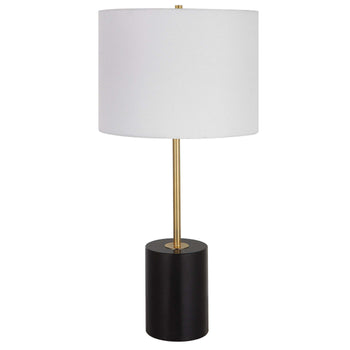 This contemporary, simplistic table lamp features a matte black metal base with gold accents. The round hardback shade is a white linen fabric. Also available in white, W26099-1.