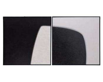 This eye-catching diptych in black and white features modern, abstract figures. A perfect addition to contemporary spaces. Features black finished wood floater frames. Each artwork is hand-painted and will feature slight variations that make every piece unique.