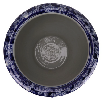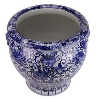 Introducing the Dragon & Floral Fishbowl. This stunning piece is the perfect size for both indoor and outdoor use, making it versatile for any space. Picture a pair of these beautiful fishbowls in your living room or dining room, paired with lush overflow palms for a striking look. The fishbowl is painted in a rich, deep navy hue, featuring a classic dragon and floral scene that adds a touch of timeless elegance to any setting.