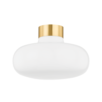 Add a modern retro sensibility to the ceiling with this rounded blown opal glossy glass shade capped by a ring of Aged Brass. The soft shape and clean metal details work with a variety of styles, making this design the perfect way to elevate the lighting in spaces throughout the home.