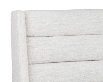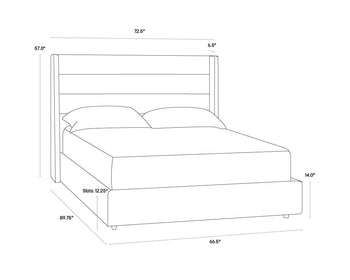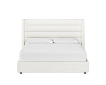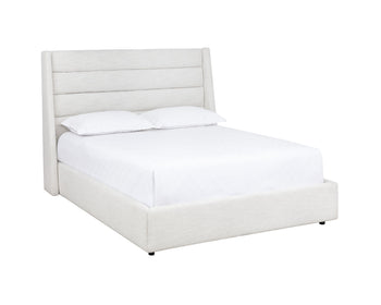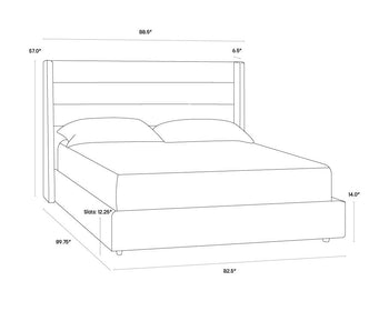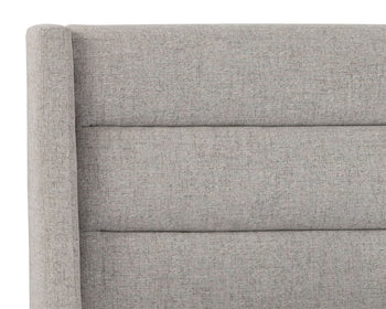 This upholstered bed features horizontal channel tufting for a modern look. Stocked in quarry fabric. No box spring is required and slats are included.